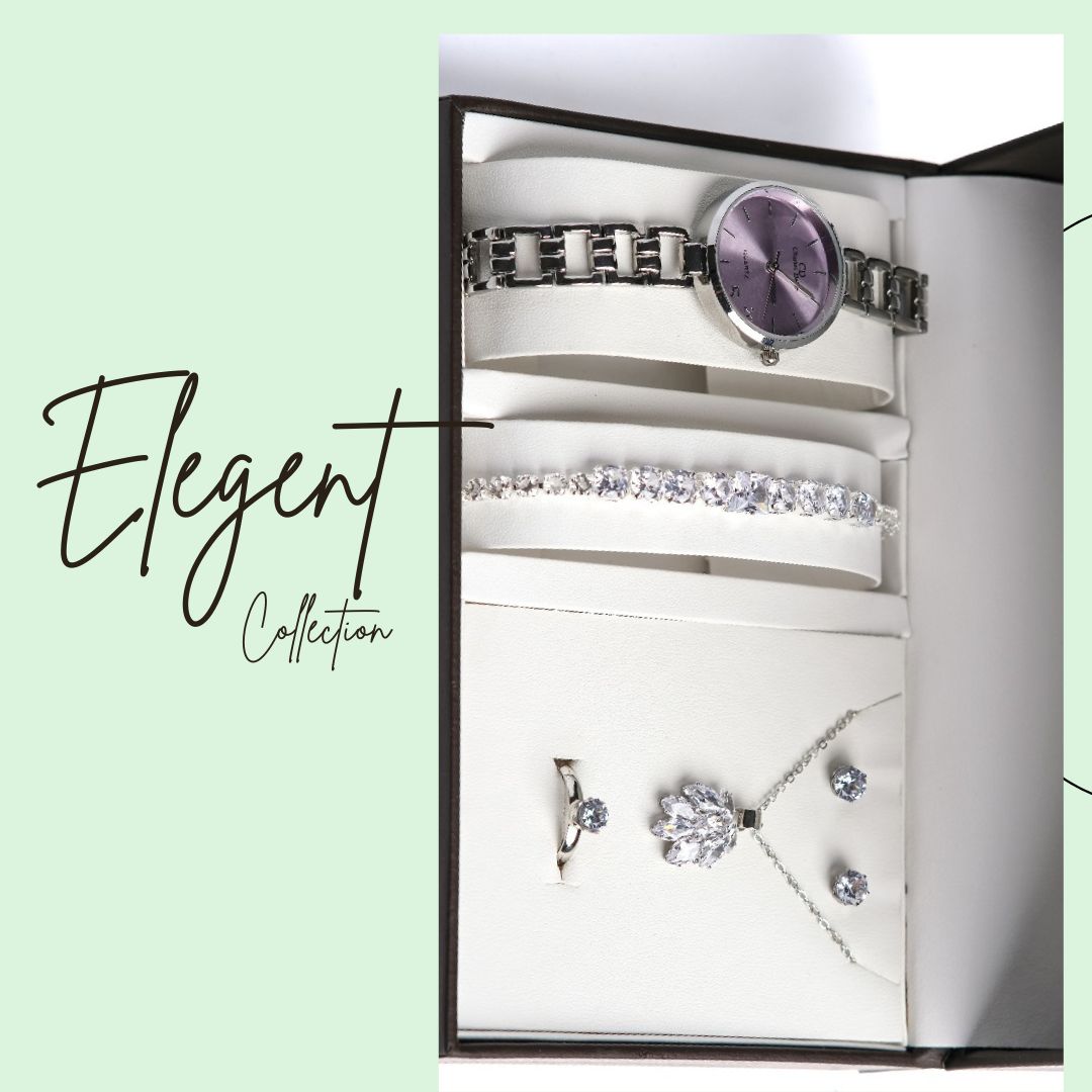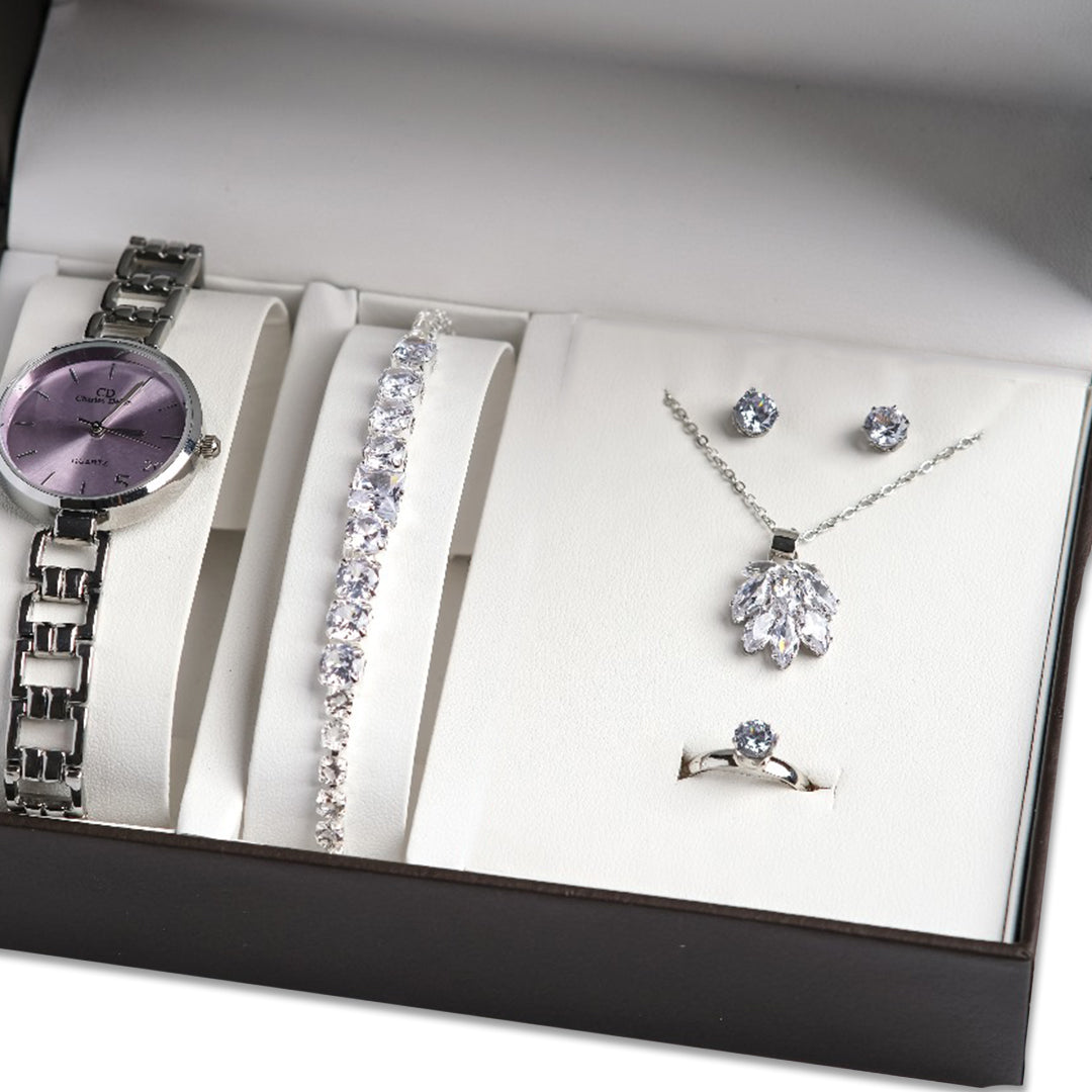 This set features a stunning necklace, matching earrings, an elegant bracelet, a shimmering ring,
