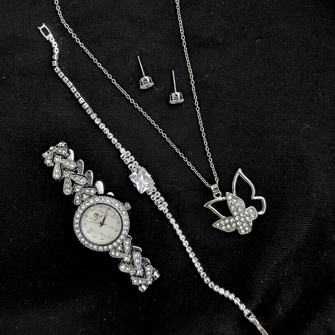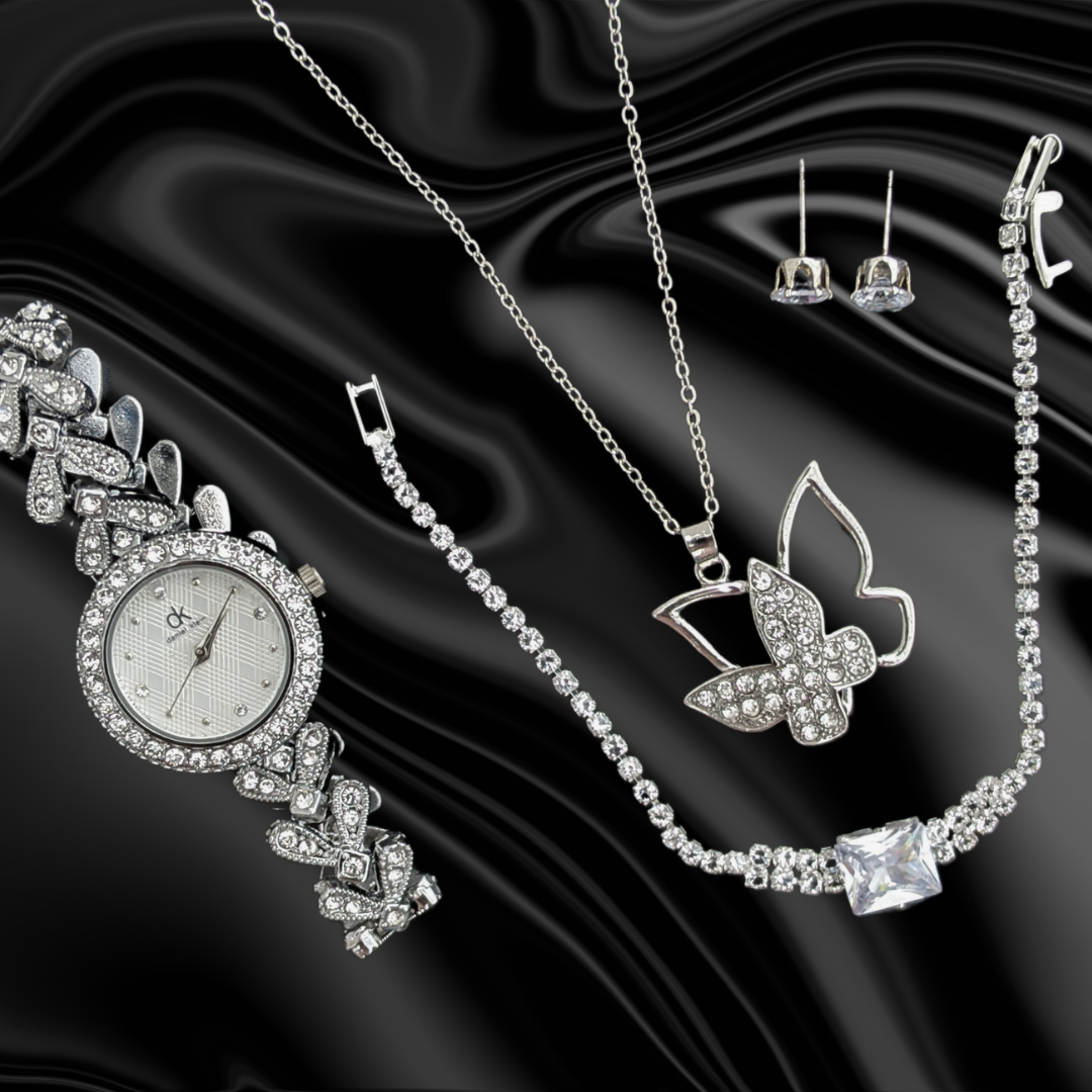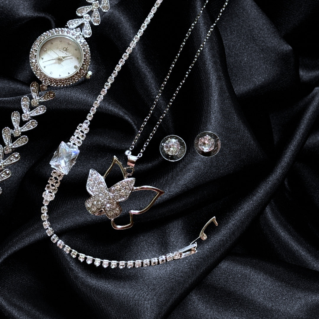 Discover the ultimate in luxury and sophistication with our 5 Pcs Jewelry Set: Exquisite Sparkle. This stunning collection is designed to add a touch of elegance to any outfit, making you shine on every occasion. Perfect for those who appreciate the finer things in life, our set includes a Butterfly Necklace, Rhinestone Bracelet, Earring Set, and a Sleek Design Rhinestone Watch. Each piece is meticulously crafted to ensure you look and feel your best.
