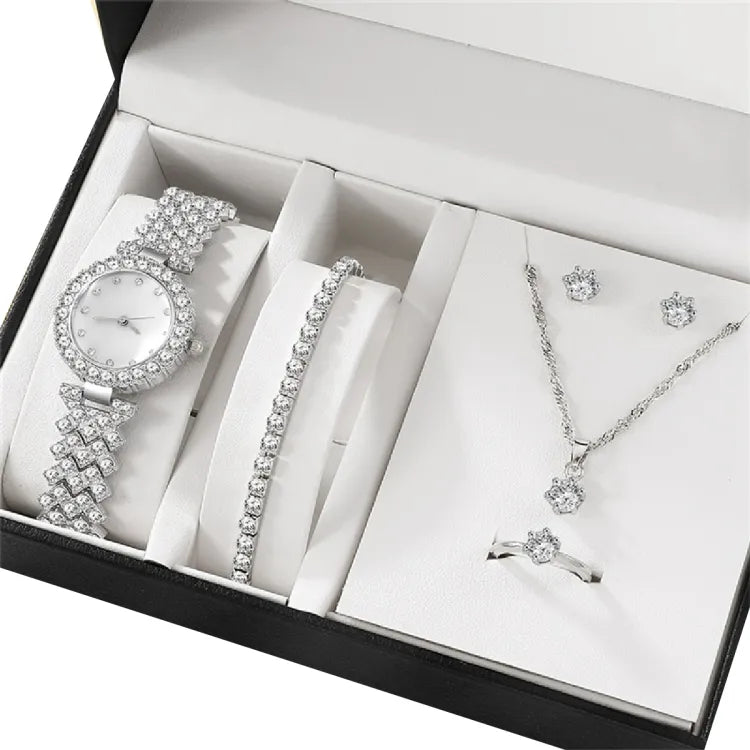 6PCS Set Luxury Watch Women Ring Necklace Earring Rhinestone Fashion Wristwatch Casual Ladies Watches Bracelet Set Clock