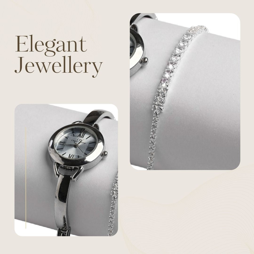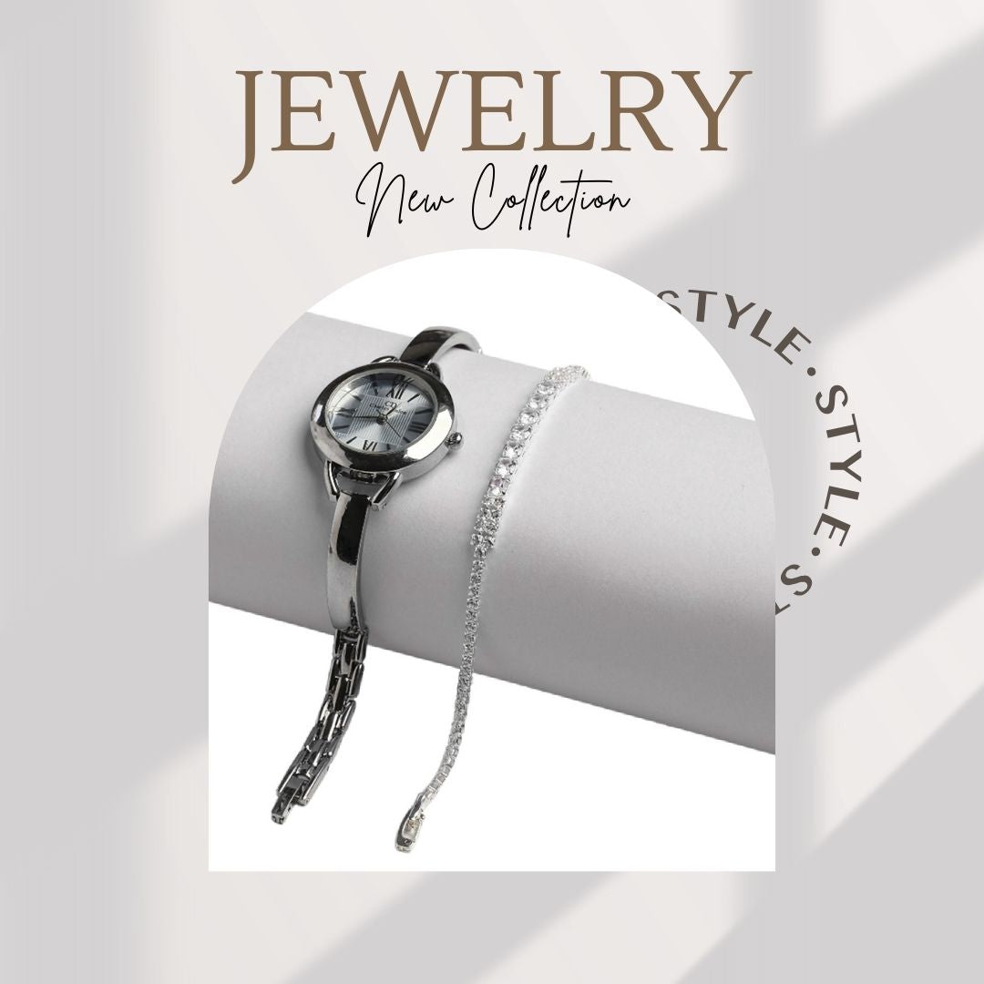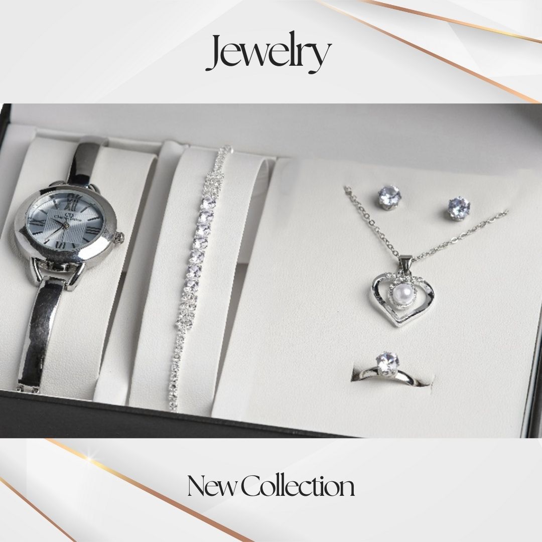 This exquisite jewelry set features a beautifully coordinated ensemble of five stunning pieces: a delicate watch ⌚, a charming bracelet 💖, elegant earrings 🌟,