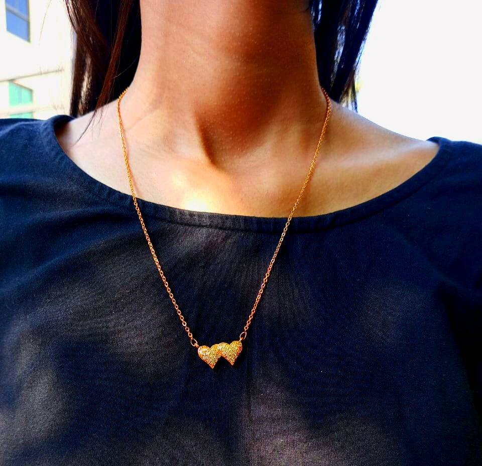 Introducing our Golden Double Heart Choker Pendant Necklace, an elegant symbol of love and unity. This exquisite piece features two interlocking hearts, crafted from shimmering golden metal, representing the intertwining of two souls in perfect harmony. The delicate choker chain adds a touch of sophistication, making it a timeless accessory for any occasion. Whether you're treating yourself or surprising your loved one, this necklace is sure to make a statement and capture hearts wherever you go.