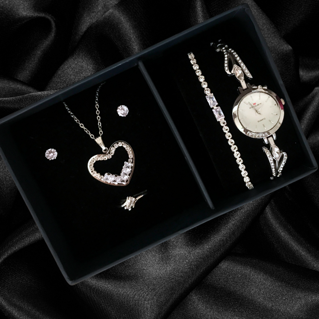 Radiant Elegance 6-Piece Luxury Jewelry Set: Rhinestone Bracelet, Heart Necklace, Earrings, Ring, and Stylish Watch